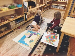 Montessori Elementary is a program that grows out of respect for the mind of a rapidly developing and insatiably curious child. Maria Montessori said, “ The elementary child has reached a new level of development. Before, he was interested in things: working with his hands, learning the names of things, now he is interested in the how and why…the problem of cause and effect.” The elementary child strives for social justice, intellectual independence, and abstract thinking. The children are interested in the world at this point in development and realize an enormous, interesting place. The world becomes their classroom as they are guided through what we refer to as the Cosmic curriculum. A spiral based curriculum that exposes students to many interrelated topics repeatedly over time. With each repetition, the children delve deeper into topics and details, making connections and developing a deeper understanding of our world. This includes profound lessons such as the origin of the universe, life on Earth, and the history of math and writing. The teacher’s responsibility is to provide the child with the materials and information to invite exploration and research. All the while, the children learn to face challenges with confidence and begin to find their own place in the world around them.
